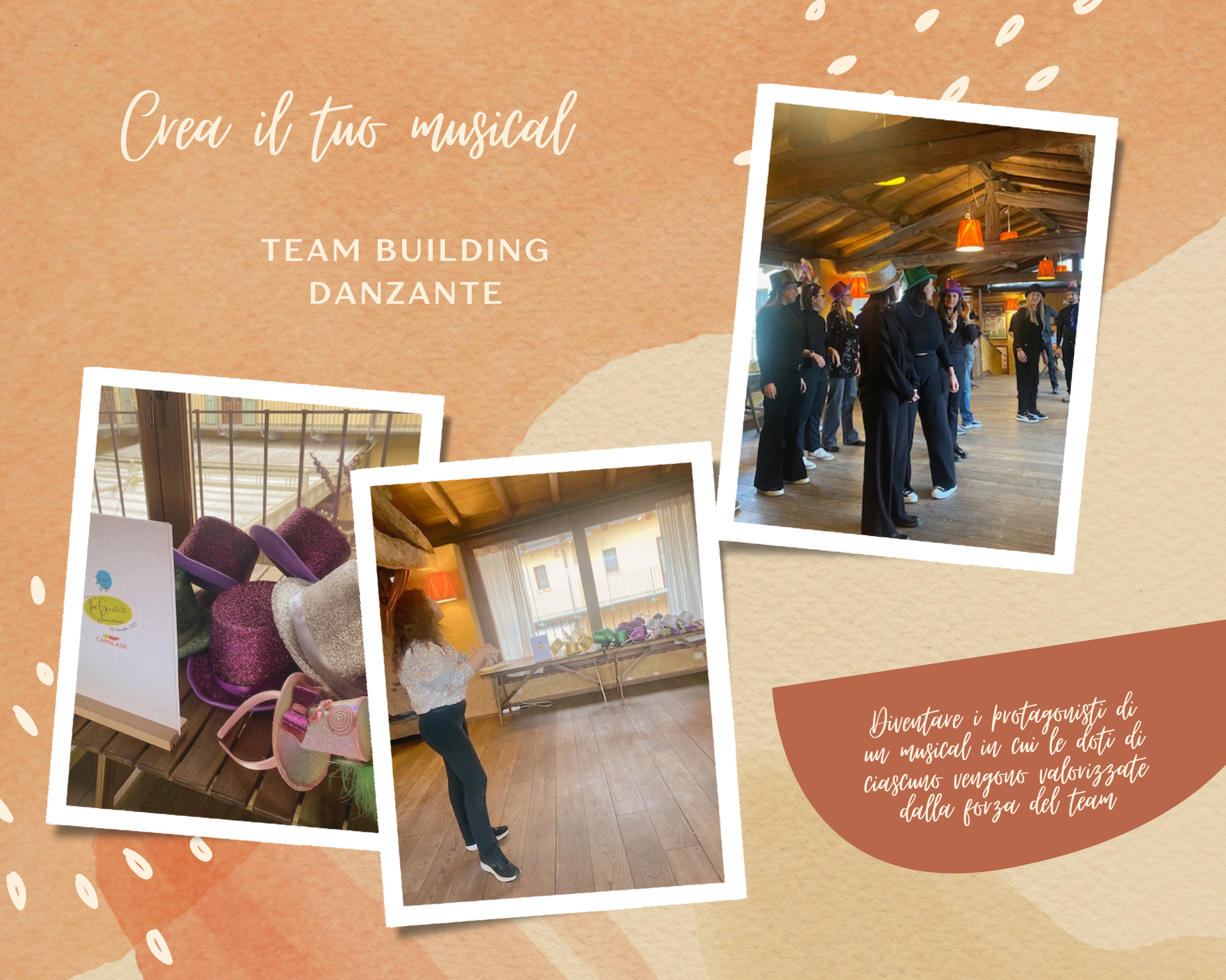 Sono queste le parole d'ordine dell'attività di team building realizzata per i responsabili delle Risorse Umane della nostra azienda cliente. In un contesto estremamente piacevole, immersi nella natura dai caldi toni autunnali, abbiamo realizzato un'attività di gruppo divertente e dinamica i cui i partecipanti, guidati dalla Dance Coach, hanno creato una breve performance in stile musicale.
