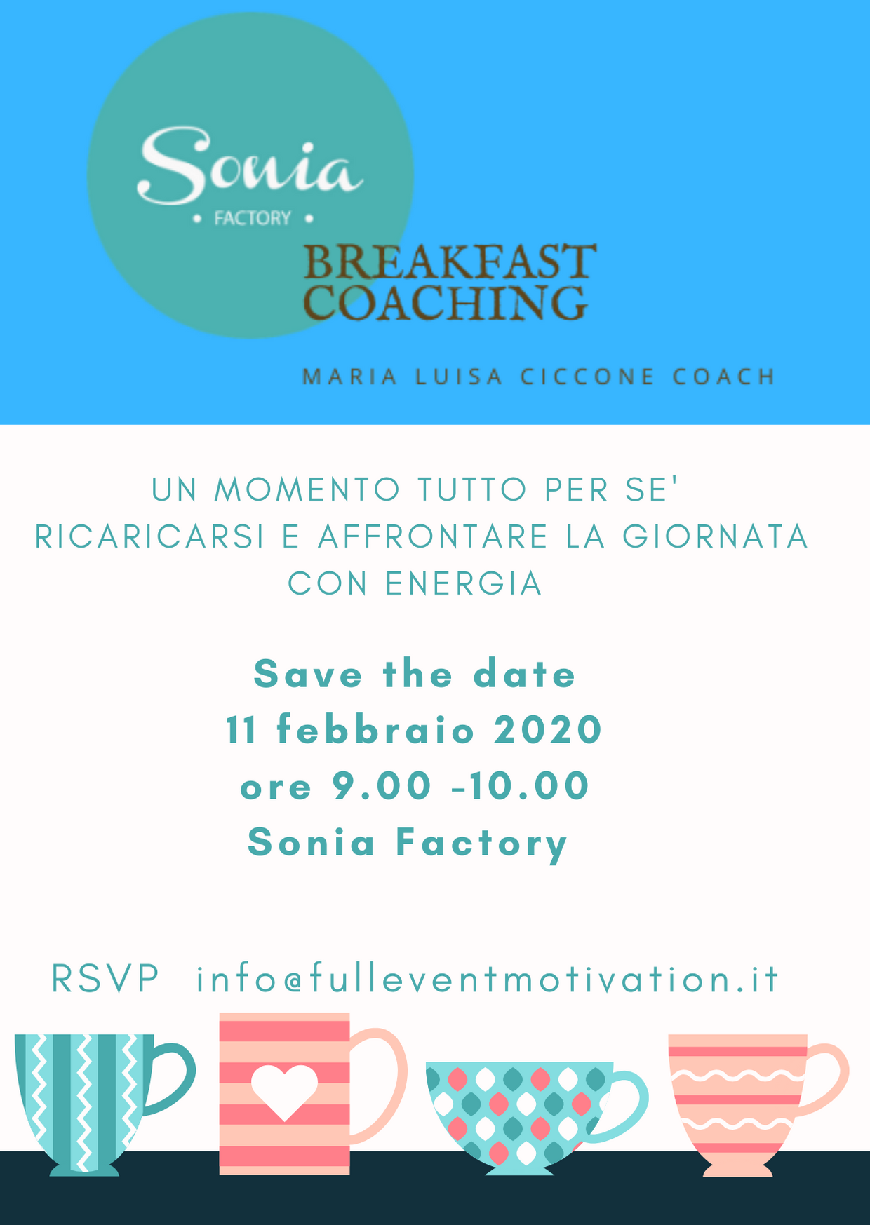 Partirà a breve, il primo già l'11 Febbraio, un ciclo di Breakfast Coaching condotti dalla nostra Coach Maria Luisa Ciccone. Si tratta di incontri mattutini, dalle 9.00 alle 10.00 per potersi focalizzare sugli obiettivi della giornata, ricaricarsi e motivarsi al fine di affrontare la propria quotidianità in maniera positiva e con il pieno di energia creativa.